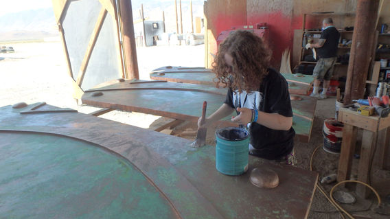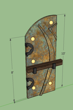 paint that was reactive to a mild acid that caused an immediate patina. Each door was 4' x 10' and were dressed with huge draw bars and faux hinges that paid homage to the city design.